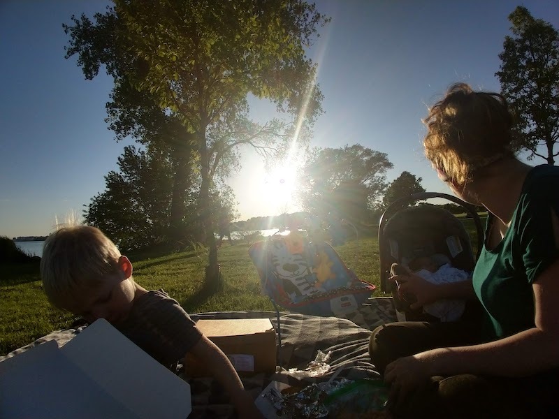 We parked at the biergarten just as the sun was starting to set over the lake. The cool breeze washing over the water felt refreshing, even while I was lugging Miles' car seat through the dusty, arid parking lot. Standing at a distance, Marissa collected three cardboard boxes filled with hot dogs, brats, cookies, and beer that we were not allowed to drink.