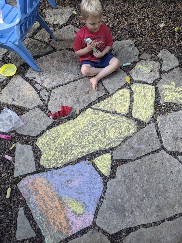 I stretched, then wandered further into the backyard. Rodney was coloring the stone pavers with sidewalk chalk. I grabbed a seat on the ground beside him, and Rodney put me to work.