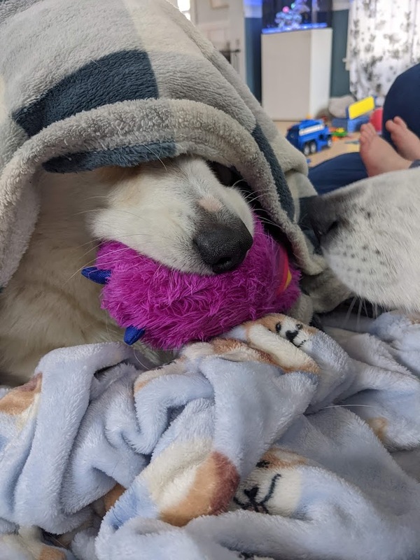 This happened just before I headed upstairs to start my work shift. I flipped the blanket over Ollie's head, and he stayed frozen in that position for a few minutes, like he was expecting something else to happen.