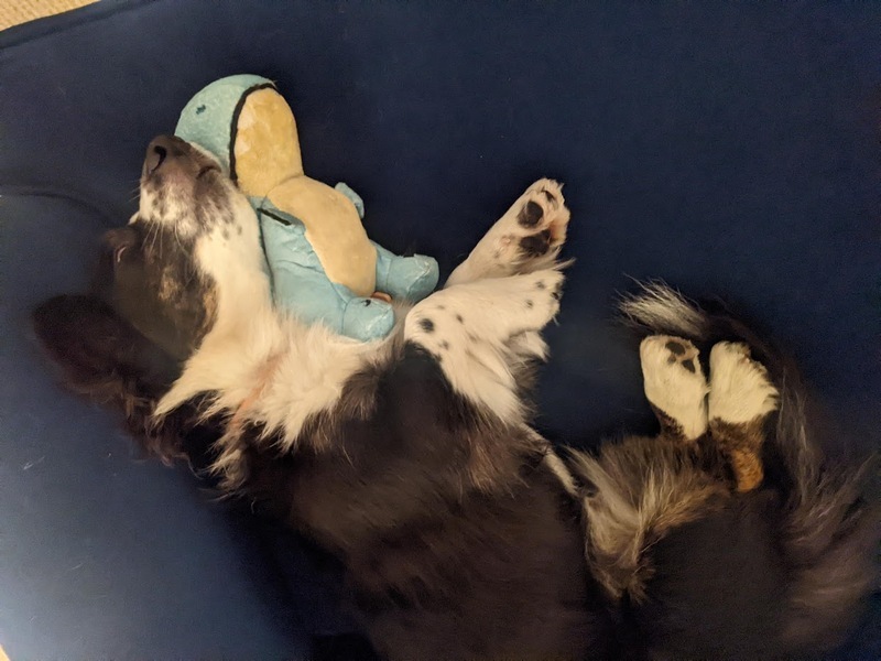 Hey everyone. Good morning. How does your Wednesday feel so far? Over here it's dark, cool, damp, and at the moment pretty cozy. Continuing this theme, for today's banner image I grabbed a picture of Minnie snuggling with her new favorite toy. It's a baby raptor. Before Minnie claimed this raptor, she chewed one of the eye's out. Why would she do that? Marissa suggested it was to keep her "humble". It probably only makes sense to Minnie.